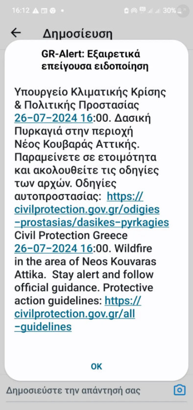 Εστάλη και προειδοποιητικό μήνυμα 112 σε όσους βρίσκονταν στην περιοχή για να παραμείνουν σε ετοιμότητα.