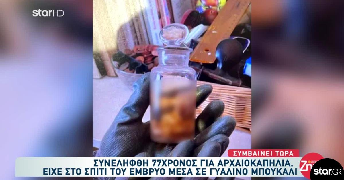 Σοκ προκαλεί η υπόθεση ενός 77χρονου από την Αττική, στο σπίτι του οποίου βρέθηκαν δεκάδες αρχαία αντικείμενα αλλά και κάτι που ξεπερνά κάθε φαντασία: ένα μπουκαλάκι με υγρό που περιείχε ανθρώπινο έμβρυο.