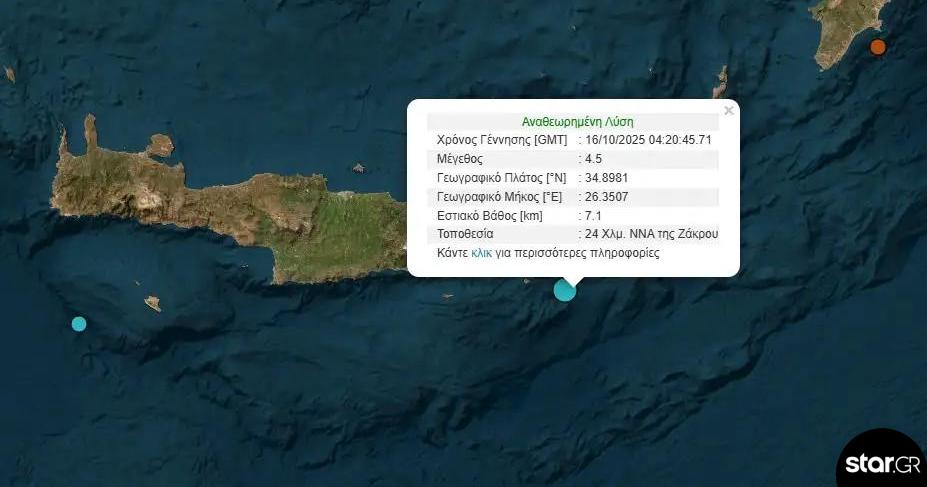 Ο σεισμός σημειώθηκε στις 7:20 κι έγινε ιδιαίτερα αισθητός στις ακτές της ανατολικής Κρήτης.