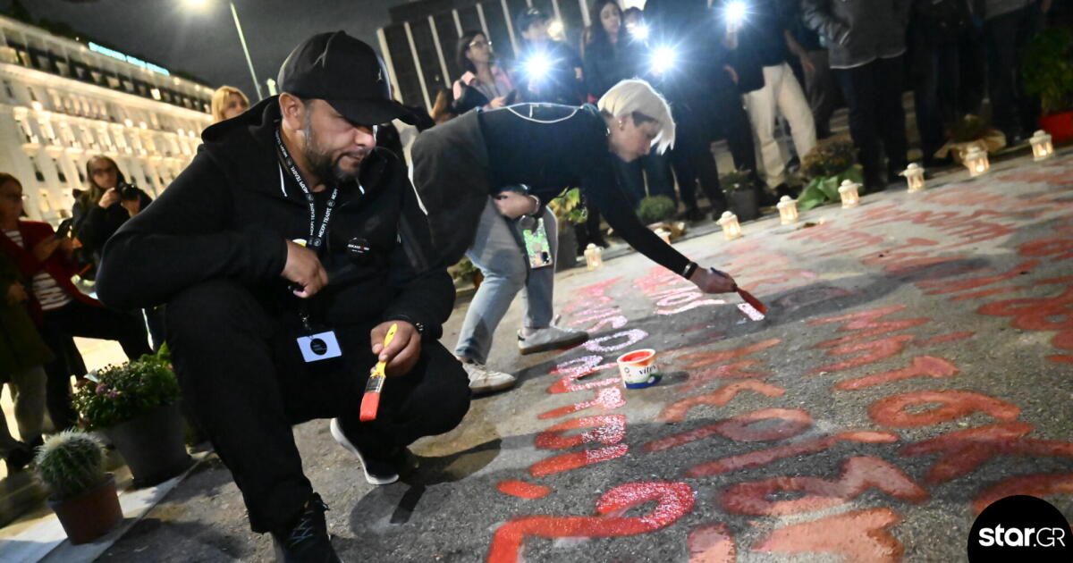 Οι συγκεντρωμένοι αλλά και συγγενείς των θυμάτων, μεταξύ των οποίων και ο Πάνος Ρούτσι, έγραψαν ξανά τα ονόματα των 57 θυμάτων, με κόκκινη μπογιά, μπροστά από τη Βουλή.