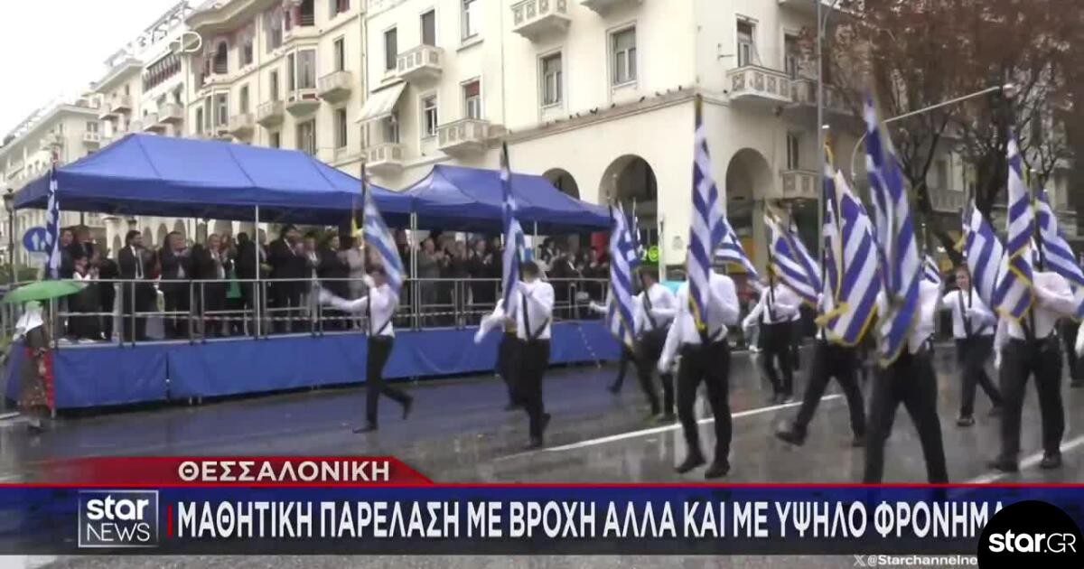 Υπό καταρρακτώδη βροχή πραγματοποιήθηκε φέτος η μαθητική παρέλαση στη Θεσσαλονίκη. Αψηφώντας τις δύσκολες καιρικές συνθήκες, οι μαθητές και οι μαθήτριες της συμπρωτεύουσας, τίμησαν τους ήρωες του 40 που έδωσαν τη ζωή τους για την πατρίδα και παρέλασαν με υπερηφάνεια.