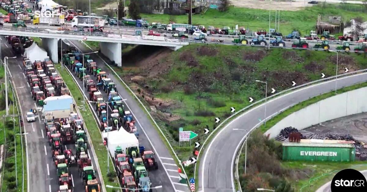 Οι εικόνες από drones του STAR δείχνουν ουρές τρακτέρ και μπλοκαρισμένες εθνικές οδούς, όπως στην Εγνατία και την Εθνική Αθηνών-Θεσσαλονίκης, προκαλώντας κυκλοφοριακή συμφόρηση από νταλίκες και ΙΧ.