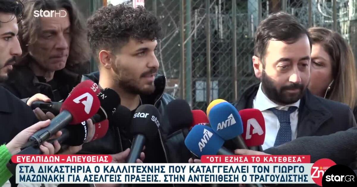 Το κατώφλι των δικαστηρίων της πρώην Σχολής Ευελπίδων πέρασε το πρωί της Πέμπτης ο νεαρός τραγουδιστής που καταγγέλλει τον Γιώργο Μαζωνάκη για ασελγείς πράξεις, συνοδευόμενος από τον δικηγόρο του Αλέξανδρο Παπαϊωαννίδη.