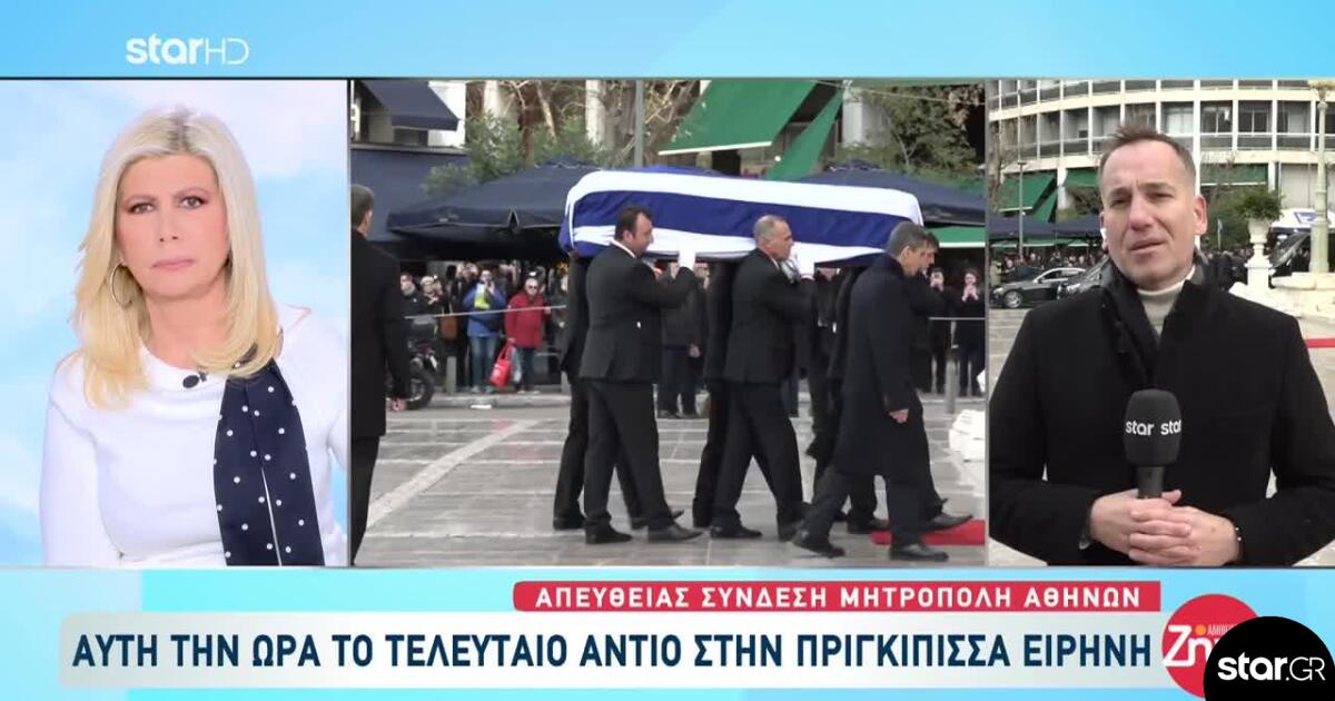 Η Ελλάδα αποχαιρετά με σεβασμό και συγκίνηση την πριγκίπισσα Ειρήνη, η οποία έφυγε από τη ζωή σε ηλικία 83 ετών στη Μαδρίτη. Η είδηση του θανάτου της σκόρπισε θλίψη τόσο στην Ελλάδα όσο και στην Ισπανία, όπου έζησε για πολλά χρόνια στο πλευρό της αδελφής της, βασίλισσας Σοφίας. Η κηδεία της πραγματοποιείται σε κλίμα βαρύ, με την παρουσία συγγενών, φίλων και εκπροσώπων ευρωπαϊκών βασιλικών οίκων, αλλά και πολιτών που επιθυμούν να αποτίσουν τον ύστατο φόρο τιμής.