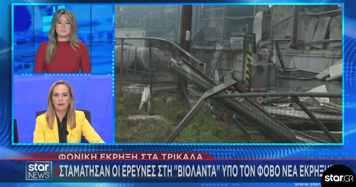 Eξελίξεις στην υπόθεση της τραγωδίας στα Τρίκαλα καθώς οι αρχές διέκοψαν τις έρευνες στο εργοστάσιο Βιολάντα. Όπως μετέδωσε η Τασούλα Παπανικολάου στο μεσημβρινό δελτίο ειδήσεων του Star υπάρχει μεγάλος κίνδυνος νέας έκρηξης, καθώς η διαρροή του προπανίου είναι μεγάλη.
