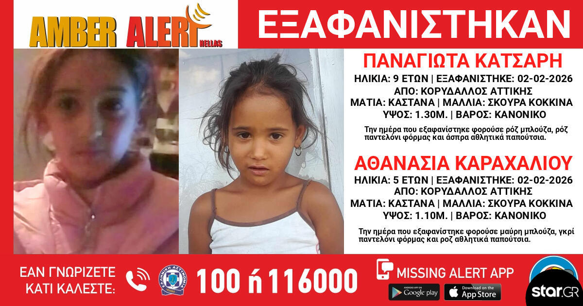 Συναγερμός έχει σημάνει στις Αρχές μετά την εξαφάνιση της 9χρονης Παναγιώτας Κάτσαρη και της 5χρονης Αθανασίας Καραχάλιου από τον Κορυδαλλό Αττικής. Τα ίχνη τους χάθηκαν τη Δευτέρα 2 Φεβρουαρίου.