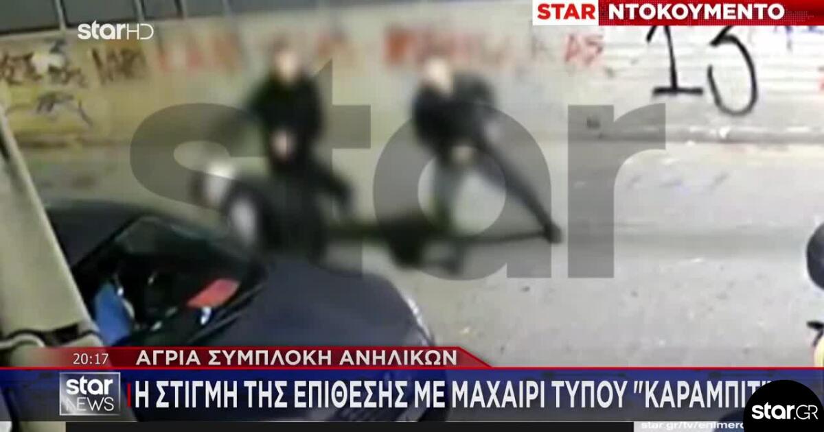 Στο βίντεο καταγράφεται η στιγμή που ο νεαρός με το μαύρο φούτερ απλώνει το χέρι του και προσπαθεί να χτυπήσει με μαχαίρι τύπου καραμπίτ τον νεαρό με την άσπρη κουκούλα.