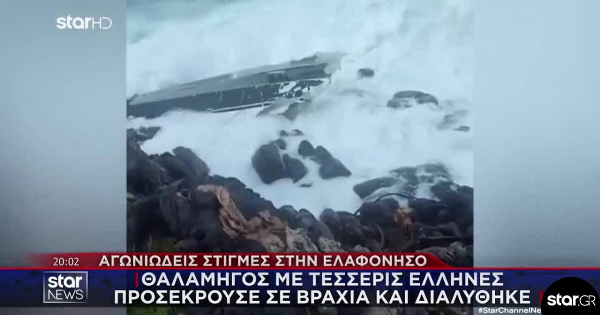 Συναγερμός σήμανε στις λιμενικές αρχές στην Ελαφόνησο, όταν θαλαμηγός 30 μέτρων με τέσσερις Έλληνες επιβαίνοντες προσέκρουσε με σφοδρότητα στα βράχια και καταστράφηκε ολοσχερώς. Βίντεο-ντοκουμέντο καταγράφει αγωνιώδεις στιγμές από την προσπάθεια διάσωσης των επιβατών, εν μέσω σφοδρής θαλασσοταραχής.