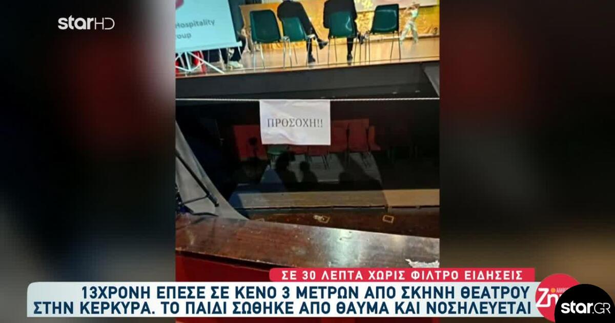 Στο Γενικό Νοσοκομείο Κέρκυρας νοσηλεύεται μια 13χρονη μαθήτρια, η οποία τραυματίστηκε σοβαρά έπειτα από πτώση στο κενό περίπου τριών μέτρων από τη σκηνή του Δημοτικού Θεάτρου της πόλης, κατά τη διάρκεια εκδήλωσης.