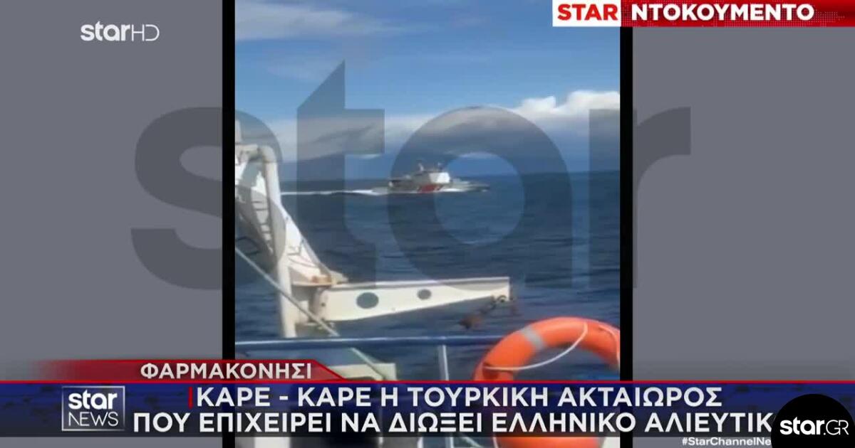 Βίντεο-ντοκουμέντο που εξασφάλισε το STAR έχει καταγράψει καρέ-καρέ, όχι μόνο τουρκικές μηχανότρατες να ψαρεύουν παράνομα δίπλα στο Φαρμακονήσι, αλλά και μια ακταιωρός της τουρκικής ακτοφυλακής να επιχειρεί να διώξει τον καπετάνιο του ελληνικού αλιευτικού, που ψάρευε νόμιμα στην περιοχή.