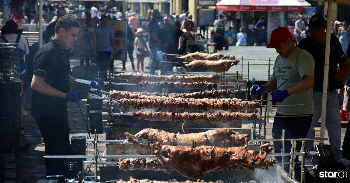 Από νωρίς το πρωί στήθηκαν οι σούβλες στο Μοναστηράκι, άναψαν τα κάρβουνα και οι ψήστες άρχισαν να μοιράζουν μεζέδες στους περαστικούς.