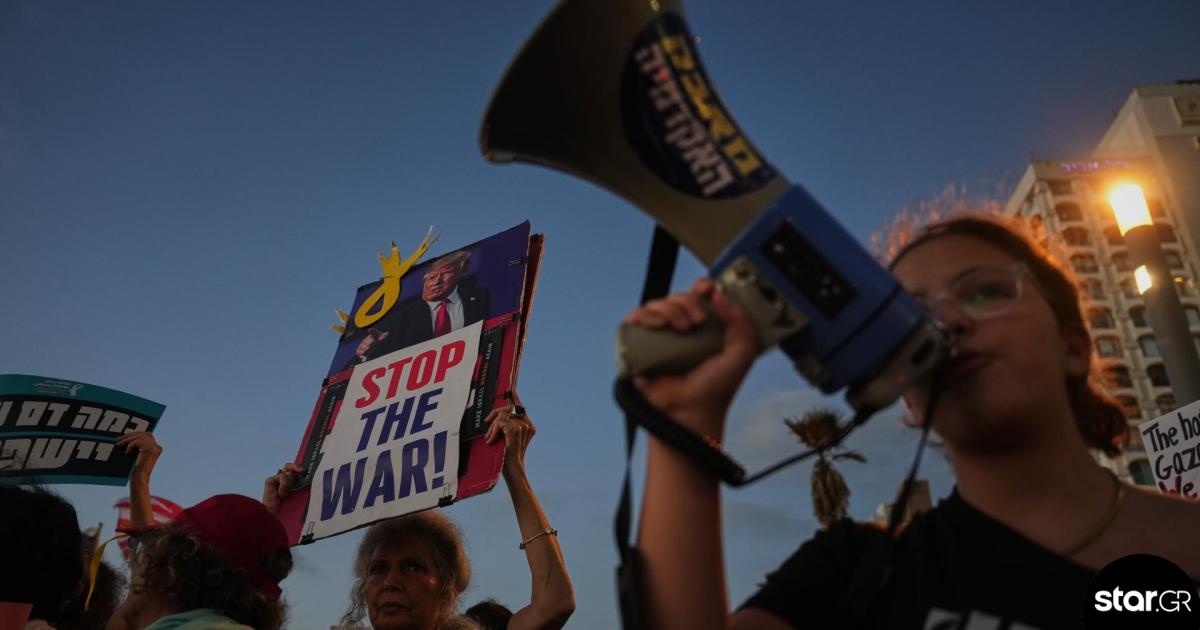 Yποστηρικτές των ομήρων που κρατούνται από τη Χαμάς διαδηδώνουν για το τέλος του πολέμου στη Λωρίδα της Γάζας, έξω από την αμερικανική πρεσβεία στο Τελ Αβίβ, Ισραήλ, στις 29/9/25- AP Photo/Ariel Schalit