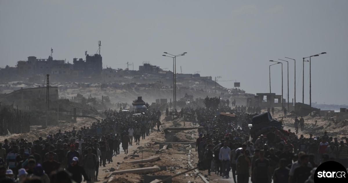 Ένα τεράστιο ρεύμα ανθρώπων εκτεινόταν κατά μήκος του οδικού άξονα αλ Ρασίντ, κοντά στη Νουσεϊράτ, στο κεντρικό τμήμα της Λωρίδας της Γάζας, με κατεύθυνση την πόλη της Γάζας.