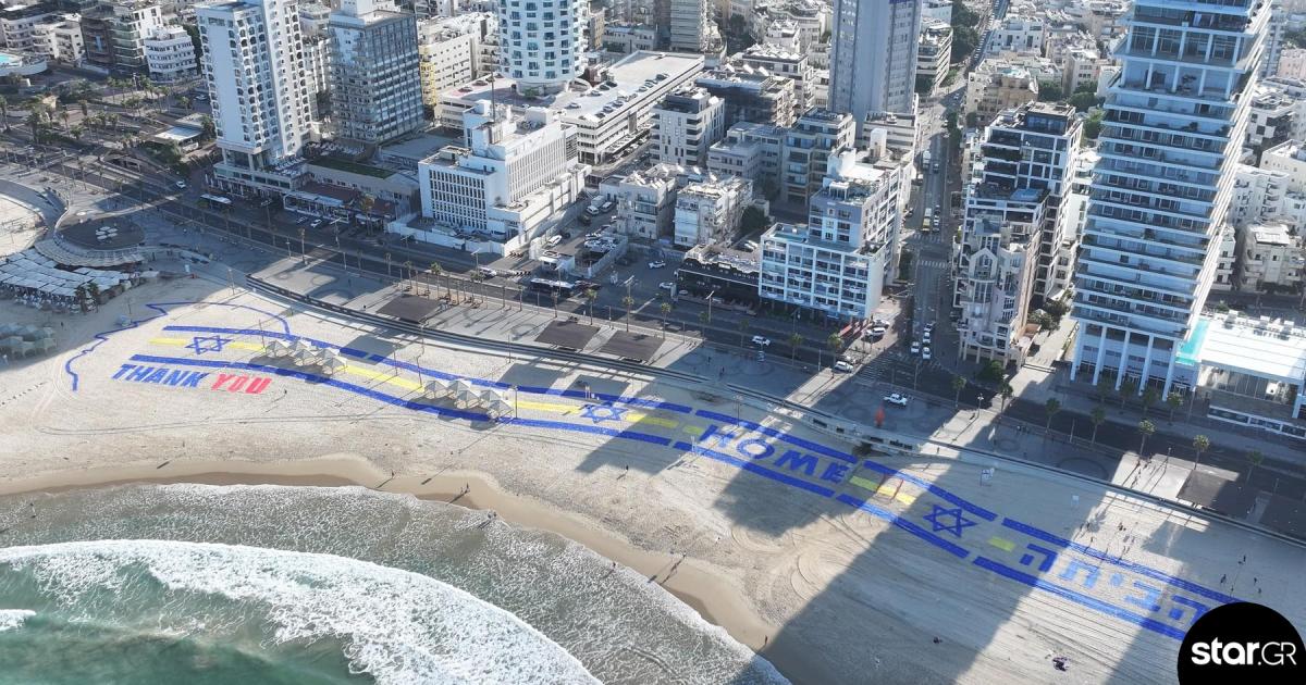 Με ένα τεράστιο «ευχαριστούμε» που γράφτηκε στην παραλία του Τελ Αβίβ καλωσόρισαν οι Ισραηλινοί τον Ντόναλντ Τραμπ που προσγειώθηκε στη χώρα το πρωί της Δευτέρας 13/10.