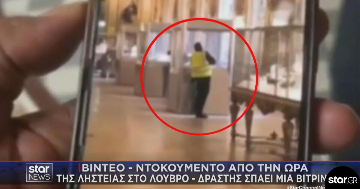 Στο βίντεο που τράβηξε κάποιος με το κινητό του, ίσως κάποιος κρυμμένος επισκέπτης, φαίνεται ένας άντρας με κίτρινο γιλέκο - ένας από τους δράστες που είχαν ντυθεί ως εργάτες - να προσπαθεί να σπάσει μία από τις βιτρίνες μέσα στην αίθουσα Απόλλων του μουσείου όπου μπήκαν με ανυψωτικό μηχάνημα.