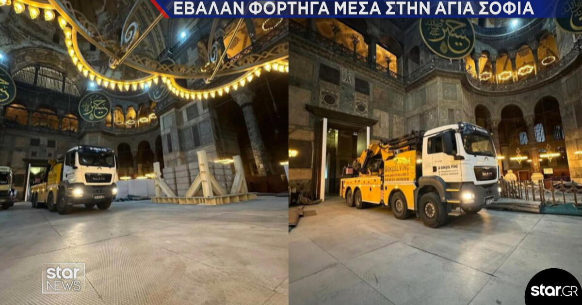 Οργή προκαλούν οι νέες εικόνες από την Αγιά Σοφιά που δείχνουν φορτηγά να έχουν μπει μέσα στο ιστορικότερο σύμβολο της Ορθοδοξίας και έναν από τους πιο εύθραυστους και ιερής σημασίας αρχιτεκτονικούς θησαυρούς του κόσμου.