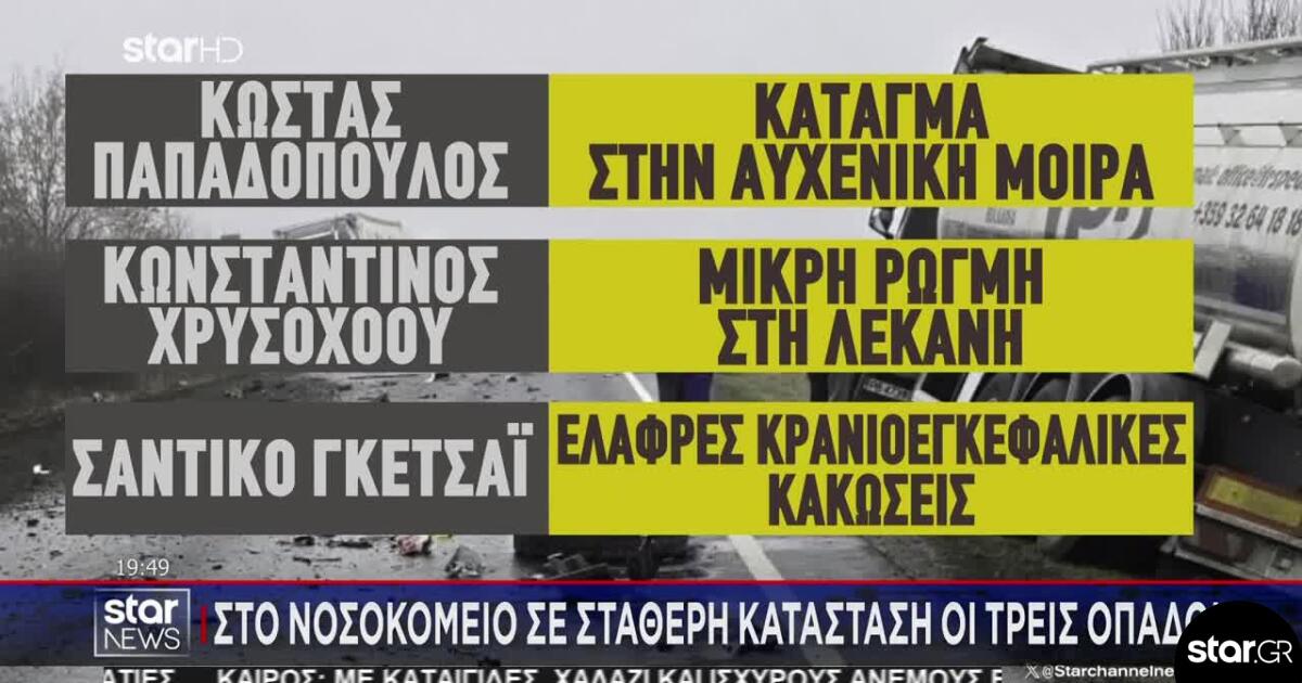 - τον Κώστα Παπαδόπουλο, που νοσηλεύεται στην εντατική αλλά χωρίς μηχανική υποστήριξη, με πολλαπλά τραύματα και κάταγμα στην αυχενική μοίρα.