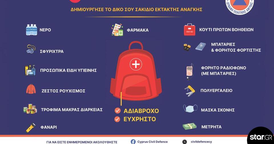 Tο υπουργείο Εσωτερικών της Κύπρου καλεί με ανάρτησή του τους πολίτες να δημιουργήσουν προληπτικά το δικό τους σακίδιο έκτακτης ανάγκης με τα απαραίτητα προϊόντα.