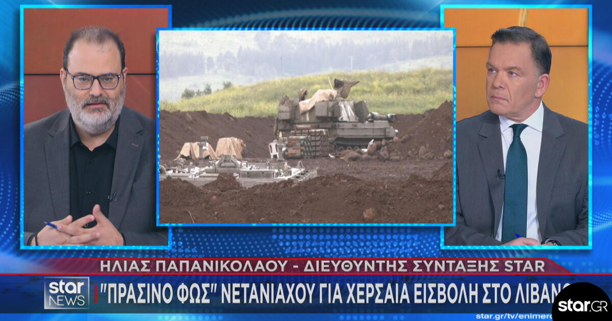 Ο Νετανιάχου άναψε συνεπώς «πράσινο φως» για χερσαία εισβολή στον Λίβανο, μια πολύ σημαντική εξέλιξη για τα τεκταινόμενα στην περιοχή, όπως εξήγησε ο Διευθυντής Σύνταξης του Star Ηλίας Παπανικολάου στο κεντρικό δελτίο ειδήσεων με τον Σπύρο Λάμπρου.