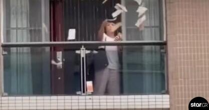 Βίντεο και φωτογραφίες που κυκλοφόρησαν στα social media δείχνουν τη γυναίκα να πετά δεσμίδες από τα μοβ χαρτονομίσματα από το μπαλκόνι της.