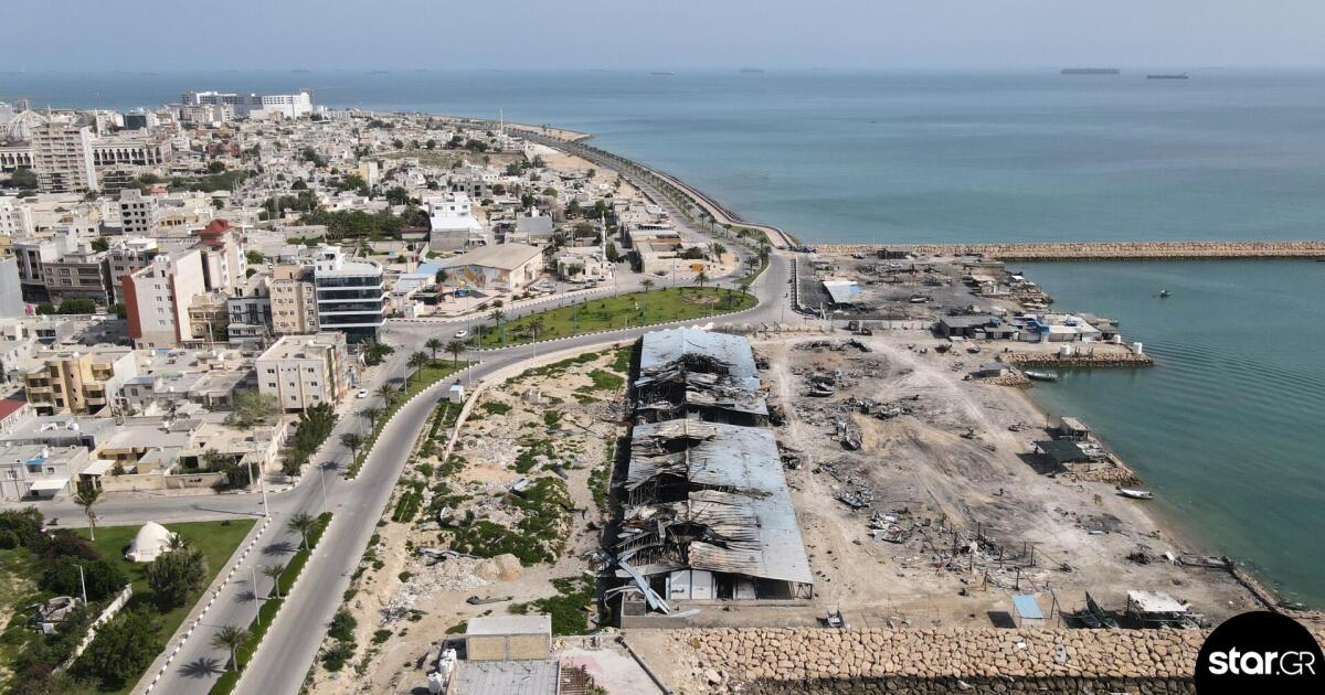 Στο βάθος τα πλοία στα Στενά του Ορμούζ και οι ζημιές από τις αεροπορικές επιδρομές στην προβλήτα του λιμανιού του νησιού Κεσμ, στο Ιράν, στις 13/4/26 (AP Photo/Asghar Besharati)