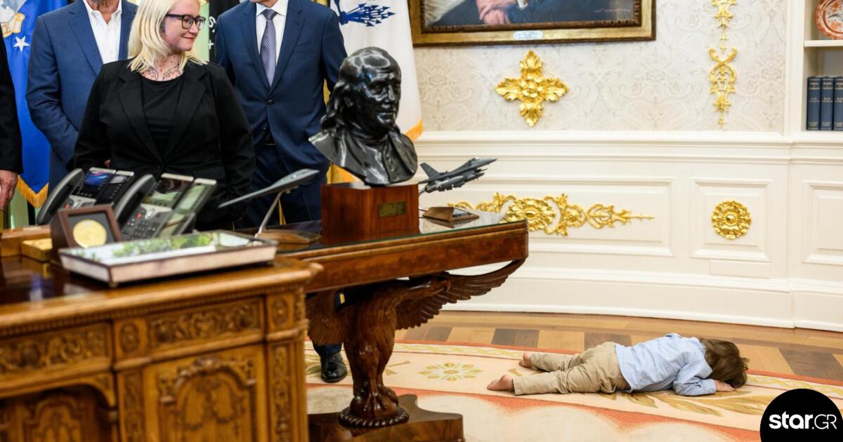 Την ώρα που ο Αμερικανός πρόεδρος απευθυνόταν σε αξιωματούχους και παρουσίαζε τις ανακοινώσεις του, ο μικρός ξέσπασε σε παιδικό θυμό, άρχισε να μπουσουλάει στο πάτωμα και στη συνέχεια ξάπλωσε μπρούμυτα πάνω στο χαλί του Οβάλ Γραφείου.