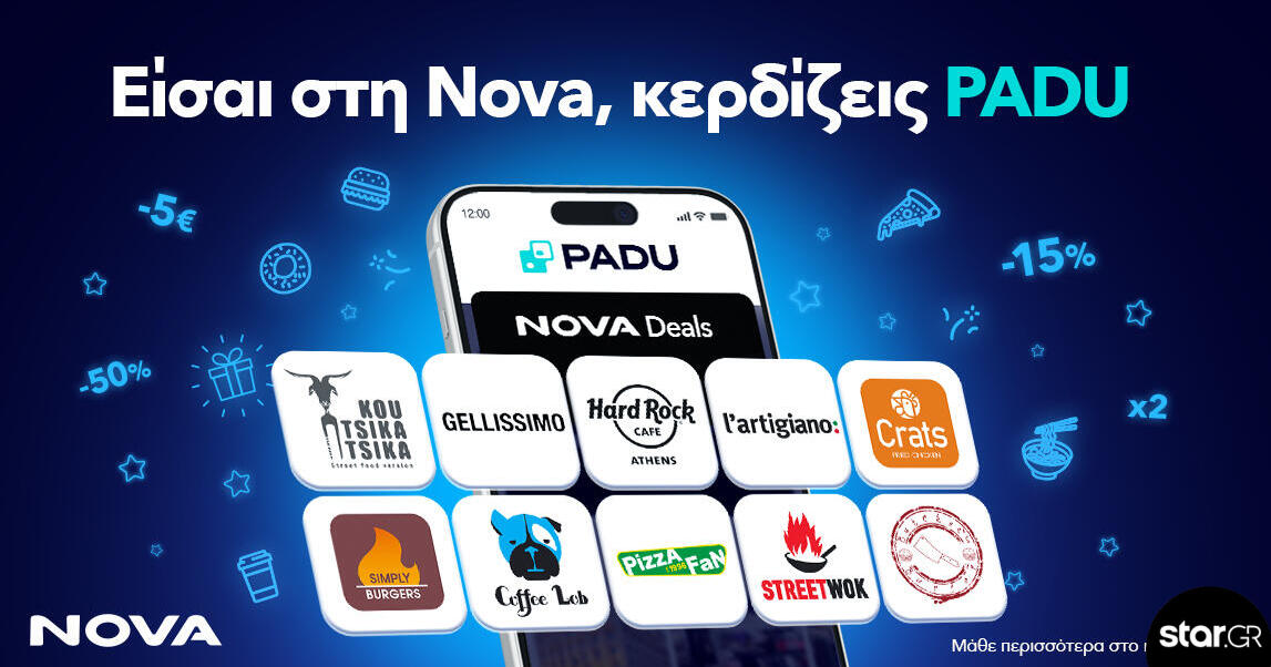 Η Nova ενισχύει περαιτέρω την εμπειρία επιβράβευσης των συνδρομητών της, μέσα από τη συνεργασία της με το PADU, προσφέροντας ακόμη μεγαλύτερη αξία στην καθημερινότητά τους, με αποκλειστικές εκπτώσεις και μοναδικά deals σε αγαπημένα brands φαγητού και καφέ.