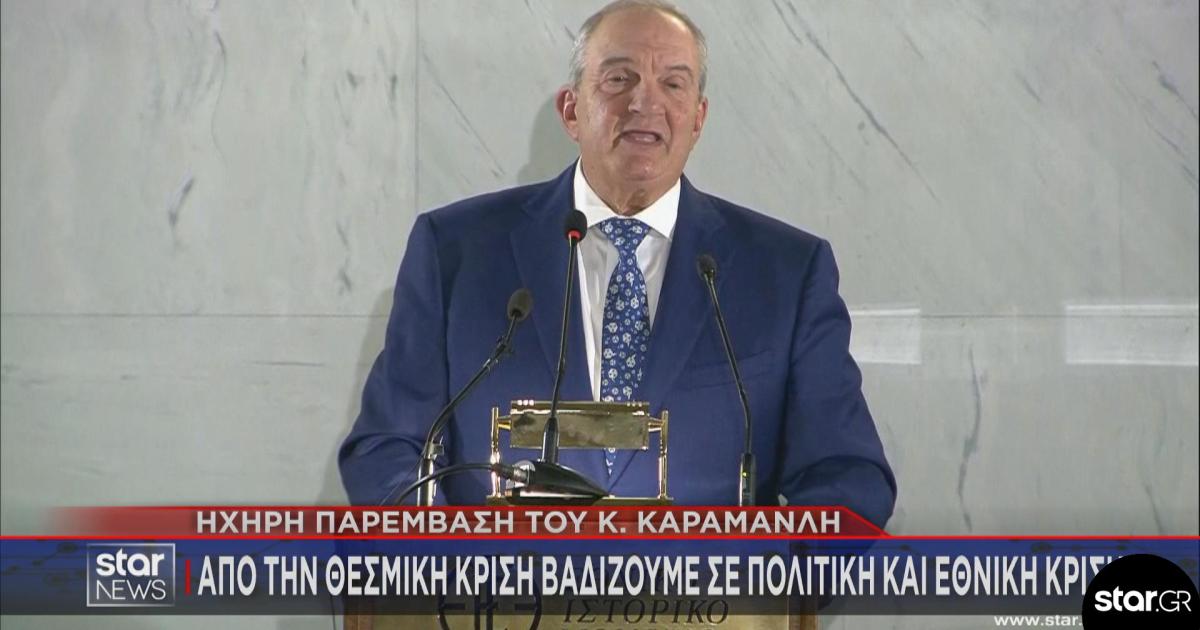 Νέα ηχηρή παρέμβαση από τον πρώην πρωθυπουργό Κώστα Καραμανλή είχαμε σήμερα σε εκδήλωση της Παναθηναϊκής Οργάνωσης Γυναικών για την Άννα Ψαρούδα - Μπενάκη στην Παλιά Βουλή. Ο κ. Καραμανλής μίλησε για μεγάλη θεσμική κρίση που μπορεί να εξελιχθεί σε πολιτική, ακόμα και σε εθνική κρίση.