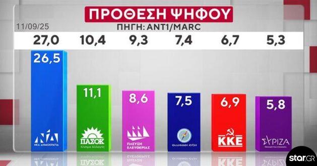 Στη νέα δημοσκόπησης της MARC για τον ΑΝΤ1, η Νέα Δημοκρατία παραμένει πρώτη δύναμη στην πρόθεση ψήφου με 26,5%, διατηρώντας σημαντικό προβάδισμα από το ΠΑΣΟΚ–Κίνημα Αλλαγής, το οποίο ενισχύεται ελαφρώς και φτάνει στο 11,1%. Τρίτη δύναμη αναδεικνύεται η Πλεύση Ελευθερίας με 8,6%, ενώ ακολουθούν η Ελληνική Λύση στο 7,5%, το ΚΚΕ στο 6,9% και ο ΣΥΡΙΖΑ με 5,8%. Ακολουθεί η Φωνή Λογικής που καταγράφει 3,1%, το ΜέΡΑ25 2,6%, το Κίνημα Δημοκρατίας 2,0%, η Νίκη 1,8%, οι Σπαρτιάτες 1,5%, ενώ η Νέα Αριστερά περιορίζεται στο 0,8%.