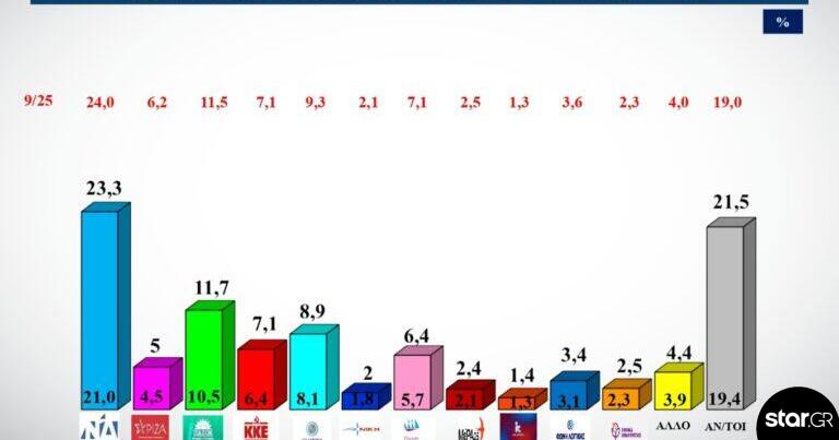 Δημοσκόπηση ALCO: Στις 11,6 μονάδες η διαφορά της ΝΔ από το ΠΑΣΟΚ