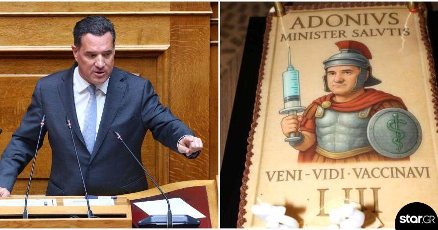 Επάνω στην τούρτα υπήρχε χαραγμένο το λατινικό ρητό «Adonis Minister Salvtis – Veni, Vidi, Vaccinavi», μια ευρηματική παραλλαγή της διάσημης φράσης του Ιούλιου Καίσαρα «Veni, Vidi, Vici» («Ήλθα, είδα, νίκησα»). Στην περίπτωση αυτή, μεταφραζόταν ως «Ήρθα, είδα, εμβολιάστηκα», προσαρμοσμένο με χιουμοριστική διάθεση στον ρόλο του υπουργού Υγείας.