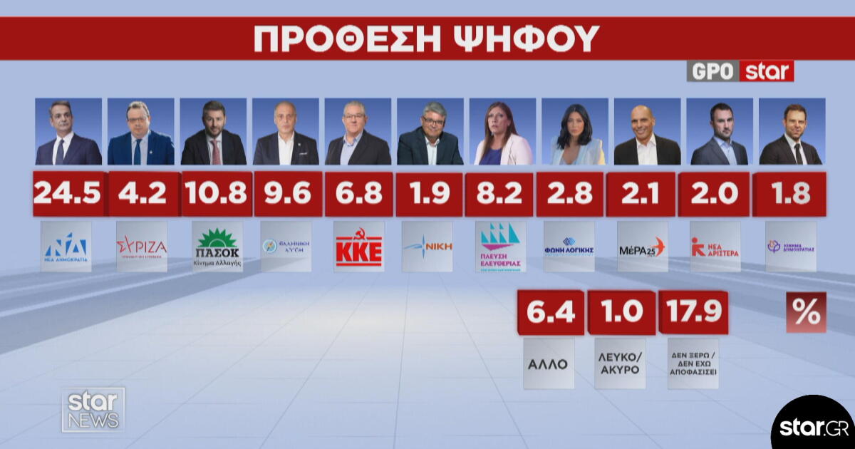 Στην πρόθεση ψήφου η ΝΔ συγκεντρώνει 24,5% έναντι 25,2% που συγκέντρωνε τον περασμένο Νοέμβριο, στην προηγούμενη έρευνα που διεξήχθη από την GPO για τo Star. Παρά την πτώση 0,7%, το κυβερνών κόμμα διευρύνει το προβάδισμα έναντι του ΠΑΣΟΚ, το οποίο καταγράφει απώλειες. Το κόμμα της αξιωματικής αντιπολίτευσης συγκεντρώνει συγκεκριμένα 10,8% από 12,6% τον περασμένο Νοέμβριο. Η Ελληνική Λύση είναι στην τρίτη θέση με 9,6% έναντι 10,4% τον περασμένο Νοέμβριο. Τέταρτη είναι η Πλεύση Ελευθερίας που ανεβάζει τα ποσοστά της στο 8,2% από 5,8%.