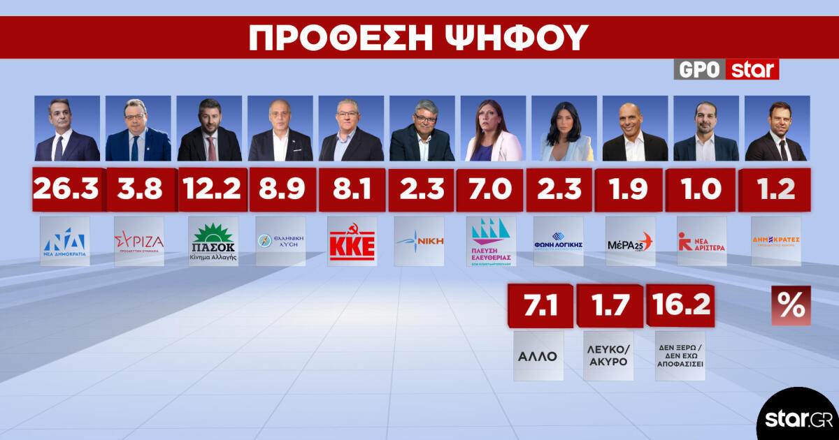 Σύμφωνα με τα στοιχεία που ανέλυσε ο Διευθυντής Ερευνών της GPO Αντώνης Παπαργύρης, στην πρόθεση ψήφου το κυβερνών κόμμα συγκεντρώνει 26,3%. Και ακολουθούν: ΠΑΣΟΚ 12,2%, Ελληνική Λύση 8,9%, KKE 8,1%, Πλεύση Ελευθερίας 7%, ΣΥΡΙΖΑ 3,8%, Νίκη και Φωνή Λογικής 2,3%, Μέρα 25 1,9%, Δημοκράτες 1,2%, Νέα Αριστερά 1% και Αναποφάσιστοι 16,2%.
