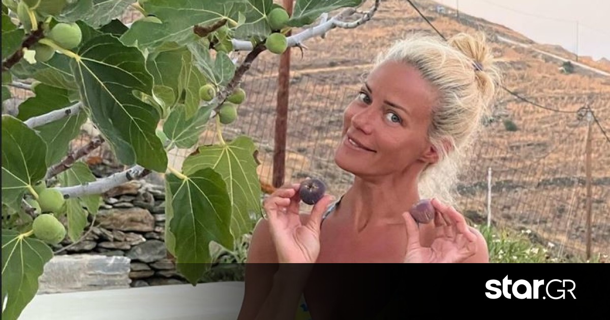 Η παρουσιάστρια μαυρισμένη δίχως ίχνος μακιγιάζ και φορώντας το μαγιό της μαζεύει φρέσκα σύκα.