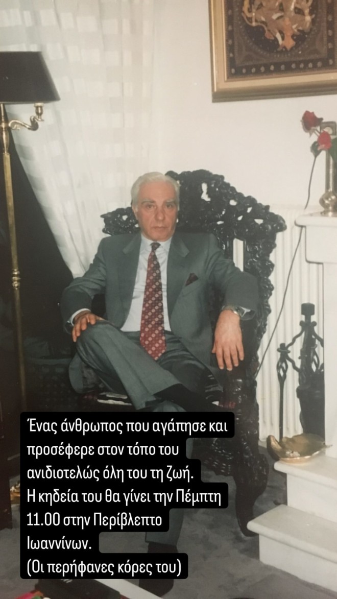 Η επιχειρηματίας και σύντροφος του Ντέμη Νικολαΐδη ανακοίνωσε μέσα από τα Instagram Stories της ότι πέθανε ο πατέρας της, Γιώργος Νικολαΐδης. Όπως έγραψε η ίδια η κηδεία του θα πραγματοποιηθεί την Πέμπτη 27/3 στα Ιωάννινα.
