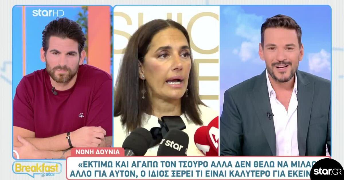 Η Νόνη Δούνα τόνισε ότι έχει καλή επικοινωνία με τον Κώστα Τσούρο και πάντα τον σκέφτεται με θετικά συναισθήματα: «Θέλω να πηγαίνει καλά. Για όλους το αισθάνομαι αυτό».