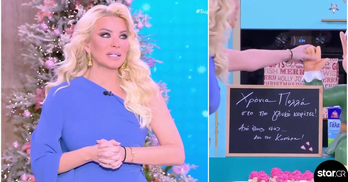 Η παρουσιάστρια εμφανίστηκε με μωβ-μπλε σύνολο και στα μαλλιά της είχε ανάλαφρες μπούκλες. Λουλούδια κι ευχές «πλημμύρισαν» την έναρξη της εκπομπής.