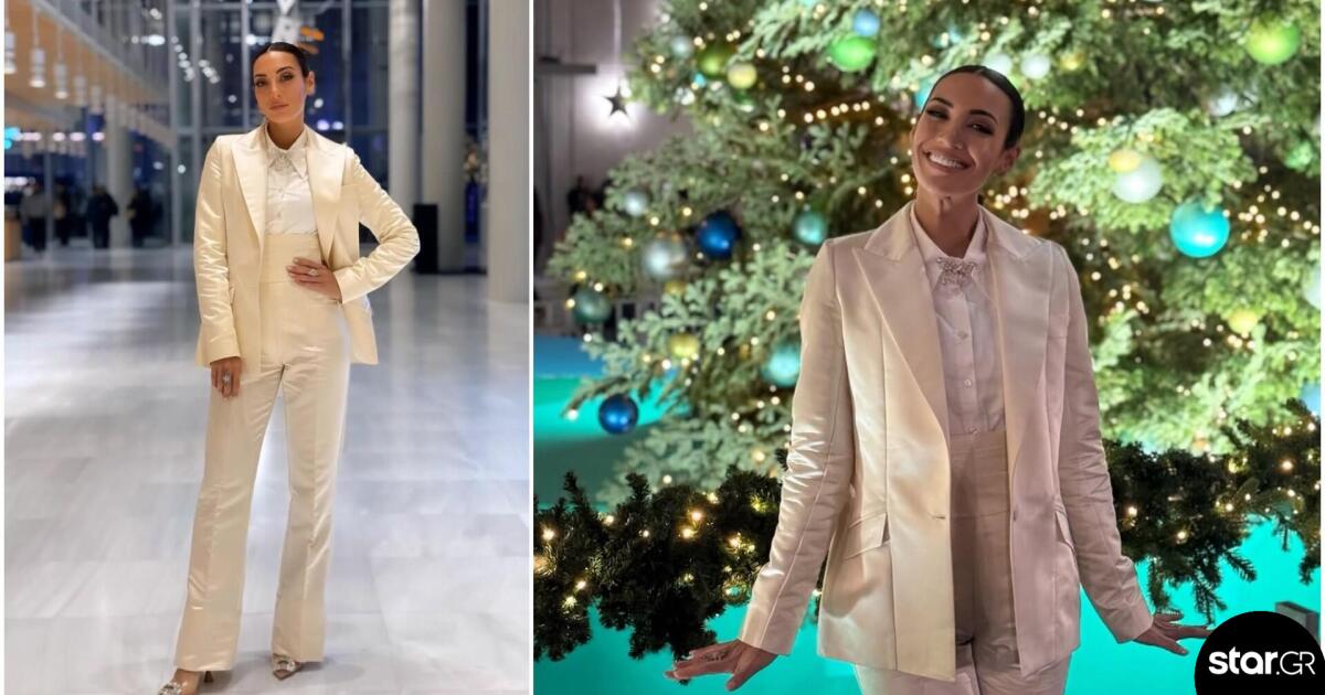 Ειδικότερα, φόρεσε creme κοστούμι από σατέν, αποτελούμενο από ψηλόμεσο παντελόνι με ζωνάρι, ελαφρώς flare στο τελείωμα και μεσάτο ασορτί σακάκι. Από μέσα φορούσε λευκό πουκάμισο, κλεισμένο μέχρι πάνω και στο κλείσιμο του πρώτου κουμπιού είχε μια καρφίτσα με στρας σε σχήμα πεταλούδας. Από κοσμήματα φορούσε αντίστοιχα δαχτυλίδια και διακριτικά σκουλαρίκια. Τα παπούτσια της ήταν διάφανα γοβάκια, με στρασένια εγγράφα. Τέλος, είχε πιασμένα τα μαλλιά της σε κότσο, όπως ταίριαζε απόλυτα στο look της.