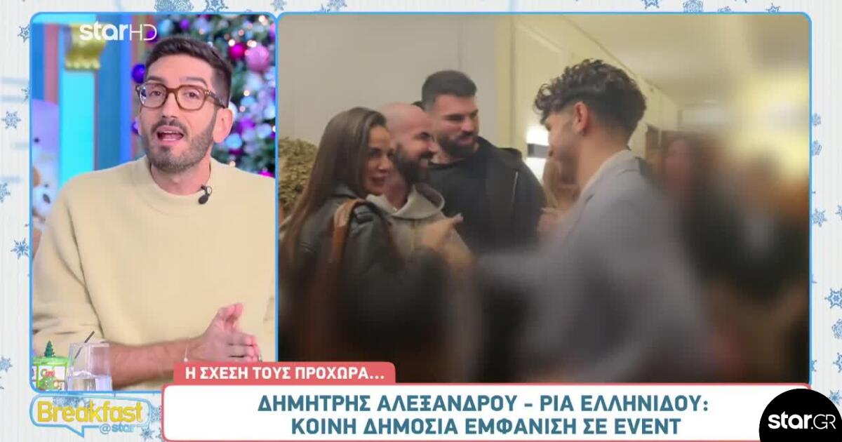 Το βράδυ της Κυριακής, 21 Δεκεμβρίου, ο Δημήτρης Αλεξάνδρου και η Ρία Ελληνίδου έκαναν την πρώτη τους κοινή δημόσια εμφάνιση, βάζοντας τέλος στις φήμες που τους ήθελαν ζευγάρι τους τελευταίους μήνες. Το ζευγάρι βρέθηκε σε εκδήλωση που διοργάνωσε γνωστό ιατρείο, όπου η παρουσία τους δεν πέρασε απαρατήρητη.