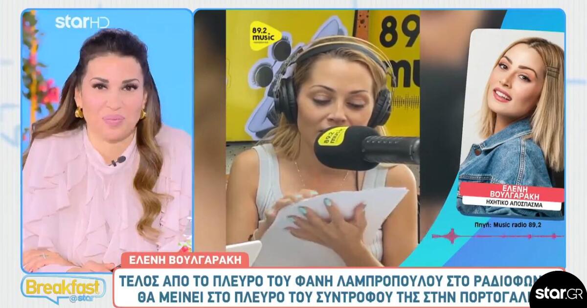 Η ραδιοφωνική παραγωγός, Ελένη Βουλγαράκη, ανακοίνωσε την απόφασή της να αποχωρήσει από την καθημερινή ραδιοφωνική εκπομπή, στην οποία βρίσκεται τα τελευταία χρόνια στο πλευρό του Φάνη Λαμπρόπουλου.