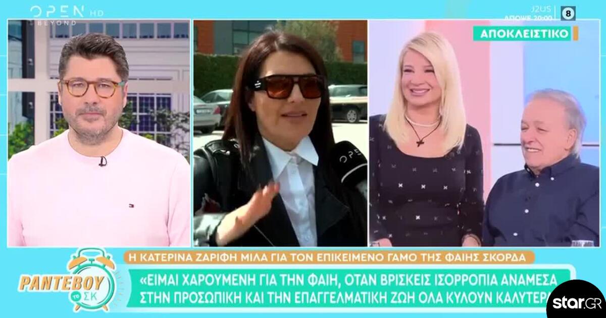 Η Κατερίνα Ζαρίφη αναφέρθηκε στον επικείμενο γάμο της Φαίη Σκορδά σε δηλώσεις της στην κάμερα της εκπομπής «Ραντεβού το ΣΚ». Η γνωστή δημοσιογράφος, η οποία συμμετέχει στο πάνελ της εκπομπής Buongiorno, αποκάλυψε πως μέχρι στιγμής δεν έχει λάβει πρόσκληση για τον γάμο της παρουσιάστριας.