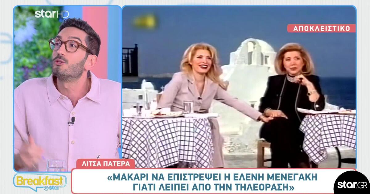 Στη συνέχεια, αναφέρθηκε και στη γενικότερη κατάσταση της τηλεόρασης, σημειώνοντας: «Πραγματικά λείπει από την τηλεόραση η Ελένη Μενεγάκη. Εγώ την αγαπάω πάρα πολύ γιατί την παραδέχομαι πάρα πολύ… ο κόσμος θέλει ανθρώπους».