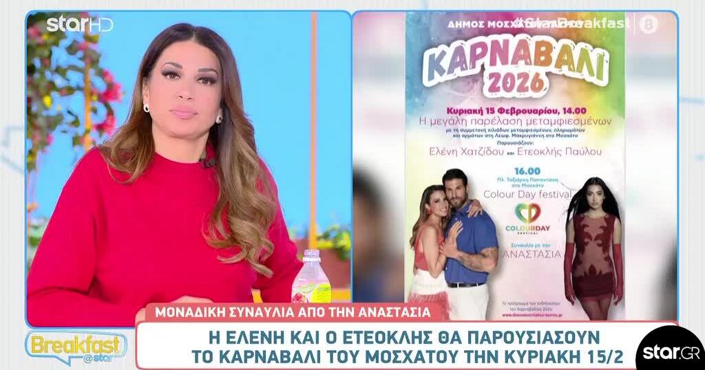 Παρουσιαστές της μεγάλης καρναβαλικής παρέλασης θα είναι η Ελένη Χατζίδου και ο Ετεοκλής Παύλου.