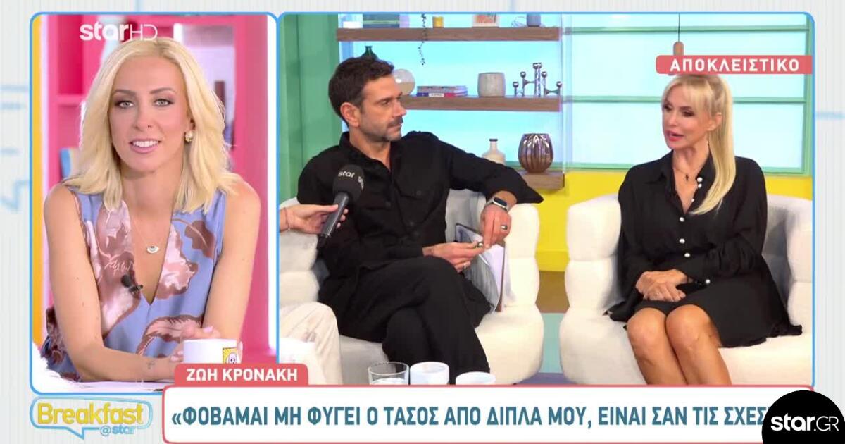 «Εμένα με ενδιαφέρει που γνώρισα τη Ζωή και τον σύζυγό της και έχω βρει δύο αδέλφια», εξομολογήθηκε ο Τάσος Ιορδανίδης. «Φοβάμαι μη φύγει ο Τάσος από δίπλα μου, είναι σαν τις σχέσεις», πρόσθεσε η Ζωή Κρονάκη. «Βγαίνουμε μαζί έξω οι τέσσερίς μας και μιλάμε για τα παιδιά μας όχι για τη δουλειά», δήλωσαν στην κάμερα του Breakfast@Star.