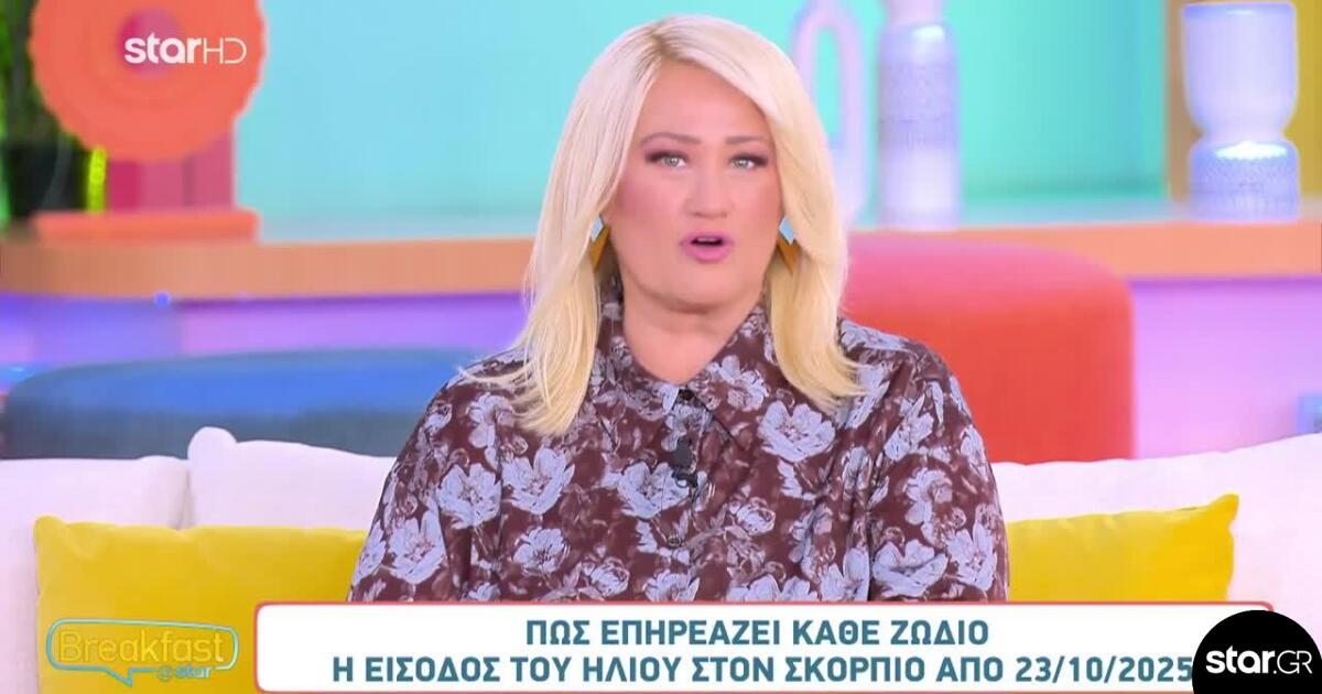 Η Άση Μπήλιου αποκάλυψε στο Breakfast@Star πώς επηρεάζει τα ζώδια ο Ήλιος, που περνάει σήμερα, Πέμπτη 23/10, στον Σκορπιό και θα παραμείνει εκεί έως τις 22 Νοεμβρίου.