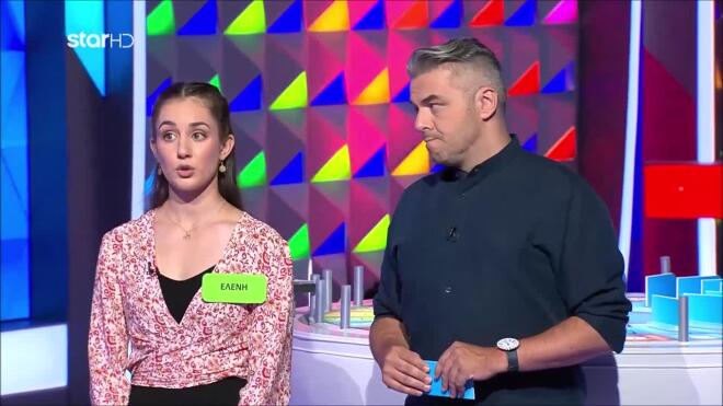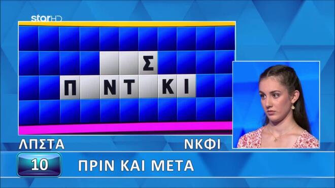 Η κατηγορία ήταν «Πριν και Μετά», όπως ανακοίνωσε κι η Νατάσα Κουβελά, με τα σταθερά γράμματα Λ, Π, Σ, Τ, Α να εμφανίζονται στον πίνακα. Η παίκτρια από την πλευρά της είπε το Ν, το Κ, το Φ, ενώ για φωνήεν επέλεξε το Ι.
