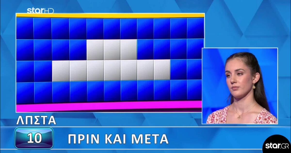 Η κατηγορία ήταν «Πριν και Μετά», όπως ανακοίνωσε κι η Νατάσα Κουβελά, με τα σταθερά γράμματα Λ, Π, Σ, Τ, Α να εμφανίζονται στον πίνακα. Η παίκτρια από την πλευρά της είπε το Ν, το Κ, το Φ, ενώ για φωνήεν επέλεξε το Ι.