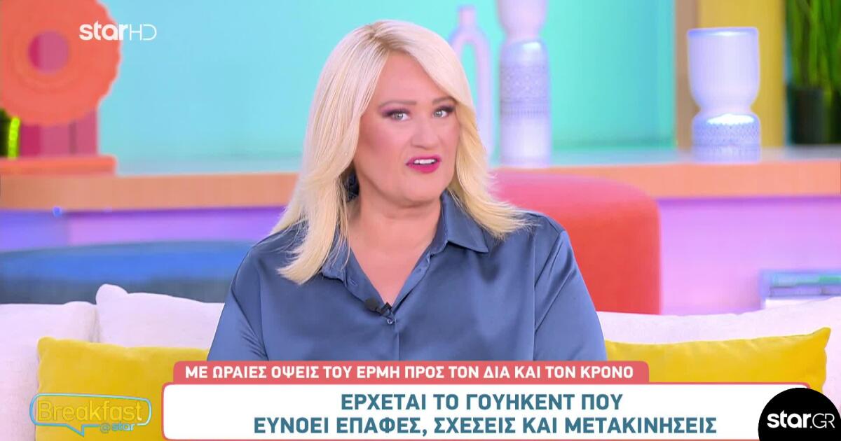 «Ο Ερμής κάνει δύο ωραίες όψεις μέσα στο Παρασκευοσαββατοκύριακο. Σήμερα έχουμε το τρίγωνο με τον Δία. Ο Ερμής, εκτός από το ότι είναι ο πλανήτης των Δίδυμων και της Παρθένου, είναι ο πλανήτης που σχετίζεται με την επικοινωνία, τις επαφές, τις μετακινήσεις, τα ταξίδια, τις εμπορικές δοσοληψίες, όλα αυτά τα ζητηματάκια. Οπότε μέσα σε αυτές εδώ πέρα τις μέρες και ειδικά τώρα που κάνει το τρίγωνο με το Δία σήμερα, καταλαβαίνετε τι μας λέει. Βγείτε, δεν είναι ανάγκη ντε και καλά να ταξιδέψετε αν δεν μπορείτε να κάνετε μια εκδρομή, αλλά κυκλοφορήστε λίγο. Δείτε ανθρώπους, φίλους που δεν τους βλέπετε τις άλλες μέρες που δουλεύετε, από το πρωί μέχρι το βράδυ. Κάντε πράγματα που να σας αρέσουν και κυρίως κινηθείτε», ανέφερε η Άση Μπήλιου στις καθιερωμένες αστρολογικές της προβλέψεις στην πρωινή εκπομπή του Star.