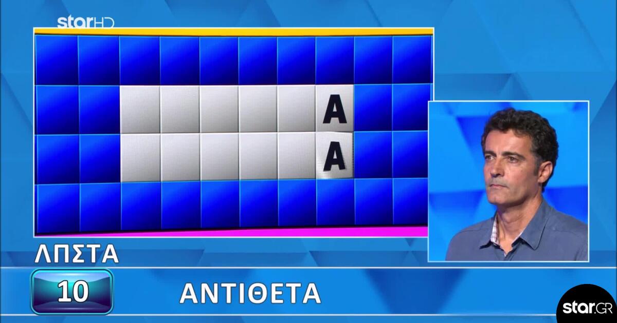 Η κατηγορία ήταν «Αντίθετα», όπως ανακοίνωσε κι η Νατάσα Κουβελά, με τα σταθερά γράμματα Λ, Π, Σ, Τ, Α να εμφανίζονται στον πίνακα. Ο παίκτης από την πλευρά του είπε το Κ, το Ν, το Ρ, ενώ για φωνήεν επέλεξε το Ε.