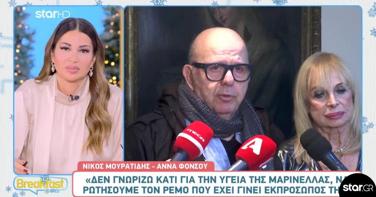 Στη συνέχεια πρόσθεσε: «Βγαίνει και μας ενημερώνει για την υγεία της. Έχει κόρη η Μαρινέλλα, μπορεί να βγει να μιλήσει όταν θέλει. Φτάνει», υποδηλώνοντας πως θεωρεί περιττή και ίσως παρεμβατική τη στάση του τραγουδιστή.